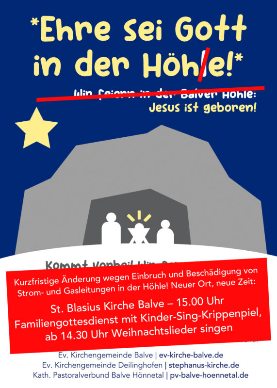 23. Dezember 2025 | Nachdem in der Nacht von Samstag auf Sonntag in die Balver Höhle eingebrochen wurde und Strom- und Gasleitungen beschädigt worden sind, kann die Höhle an Heiligabend nicht genutzt werden. Darum gibt es leider eine kurzfristige Änderung. Wir haben uns entschieden in die St. Blasius Kirche in Balve auszuweichen. Dort kann unser Kinder-Sing-Krippenspiel vor möglichst vielen Leuten stattfinden.