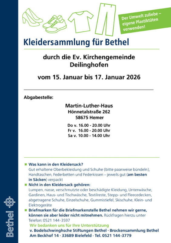Kleidersammlung für Bethel 7. Januar 2026 | Wir beteiligen uns gerne an der Kleidersammlung für Bethel. Ök. Familiengottesdienst an Heiligabend Veränderungen in der pfarramtlichen Verbindung